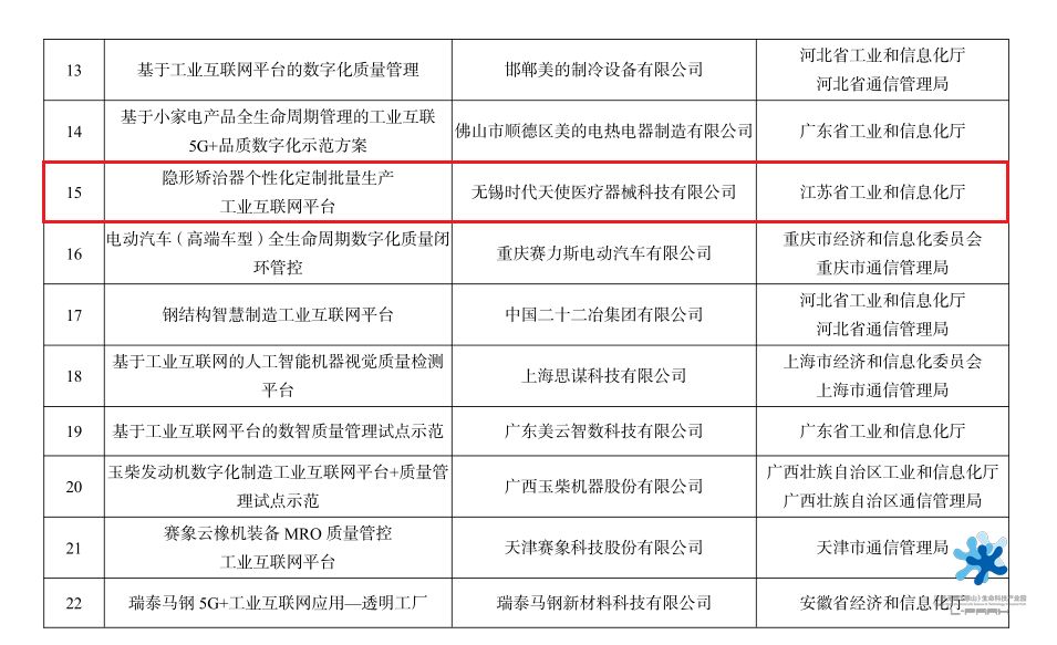日前,國家工信部公示了2022年工業(yè)互聯(lián)網(wǎng)試點示范名單,無錫時代天使醫(yī)療器械科技有限公司的“隱形矯治器個性化定制批量生產(chǎn)工業(yè)互聯(lián)網(wǎng)平臺”成功入選“工業(yè)互聯(lián)網(wǎng)平臺+質(zhì)量管理試點示范”,為惠山區(qū)唯一,當年度無錫共有3個項目入選。