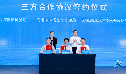 省檢驗(yàn)所、市市場(chǎng)局和惠山經(jīng)開區(qū)就合作共建惠山服務(wù)站進(jìn)行三方簽約,將從建立交流機(jī)制、明確工作職責(zé)、成立領(lǐng)導(dǎo)小組等方面做出部署,確保服務(wù)站順利建成、全面運(yùn)行,為全區(qū)醫(yī)療器械企業(yè)提供高效、專業(yè)的檢驗(yàn)服務(wù),助力惠山生命健康產(chǎn)業(yè)提檔升級(jí)。王吉東、周建輝、程松共同為服務(wù)站揭牌。