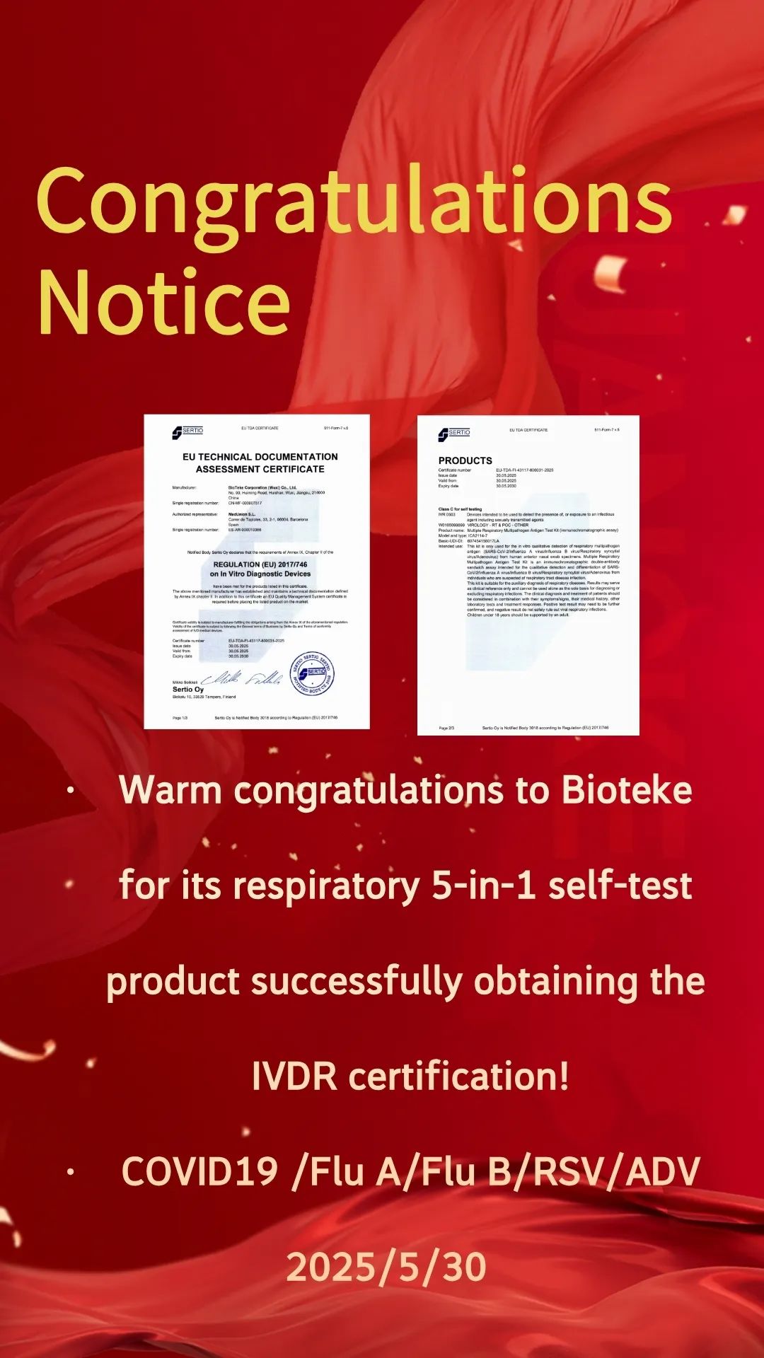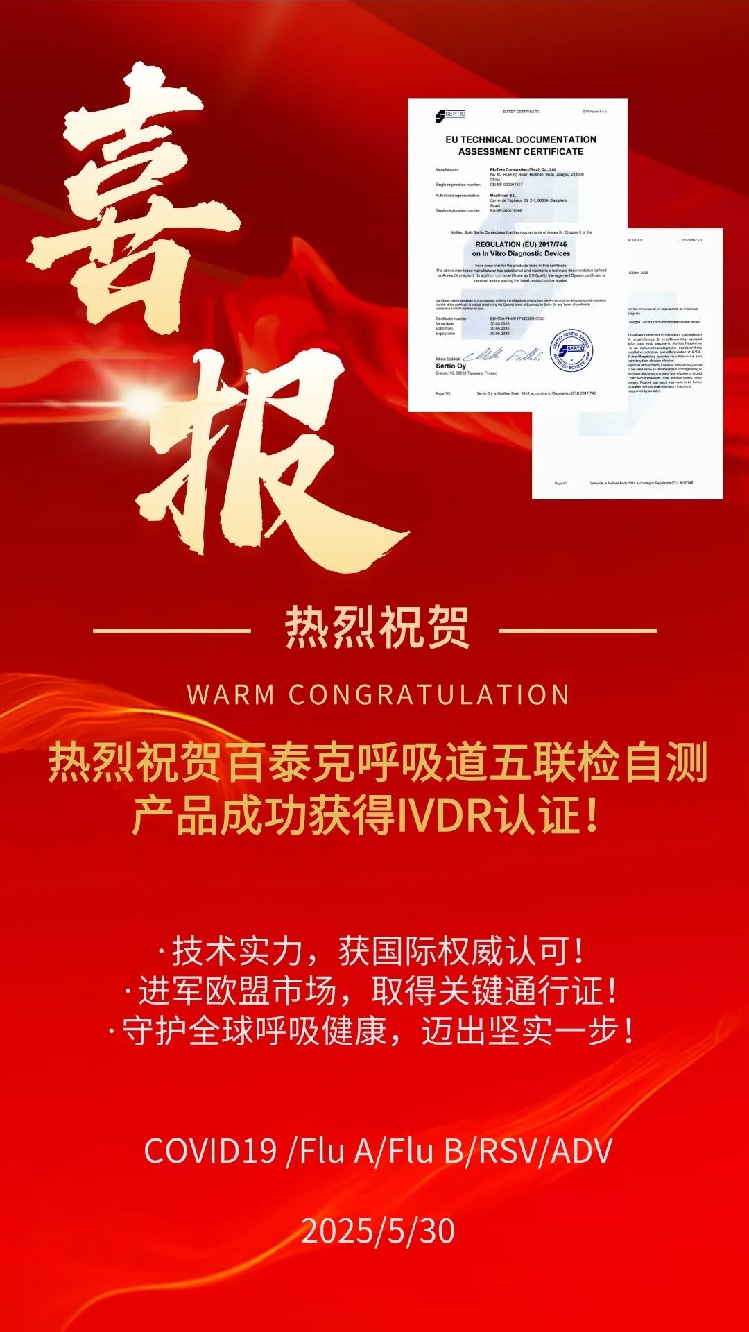 - 熱烈祝賀百泰克呼吸道五聯(lián)檢自測(cè)產(chǎn)品成功獲得IVDR認(rèn)證