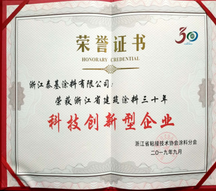 浙江泰基涂料有限公司獲得“浙江省建筑涂料三十年優(yōu)秀企業(yè)”榮譽稱號??偨?jīng)理周航帆獲得“浙江省建筑涂料三十年優(yōu)秀企業(yè)實力新人獎”。