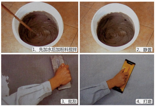 施工 | 先在容器中加入清水,按比例加入膩子粉料;使用電動攪拌機攪拌,混合比例﹙粉料:水﹦25:8.5﹚;充分攪拌5-10分鐘至均勻,沒有顆粒,靜置3-5分鐘,再攪拌一次即可使用;通常膩子批刮建議采用抹刀進行施工,已獲得細膩平整的表面 |